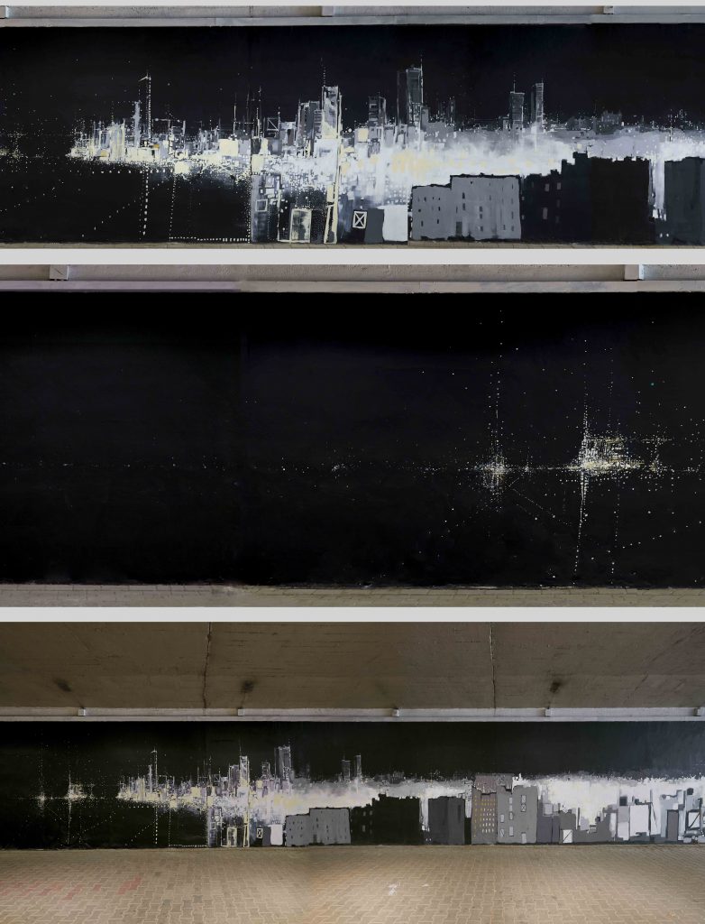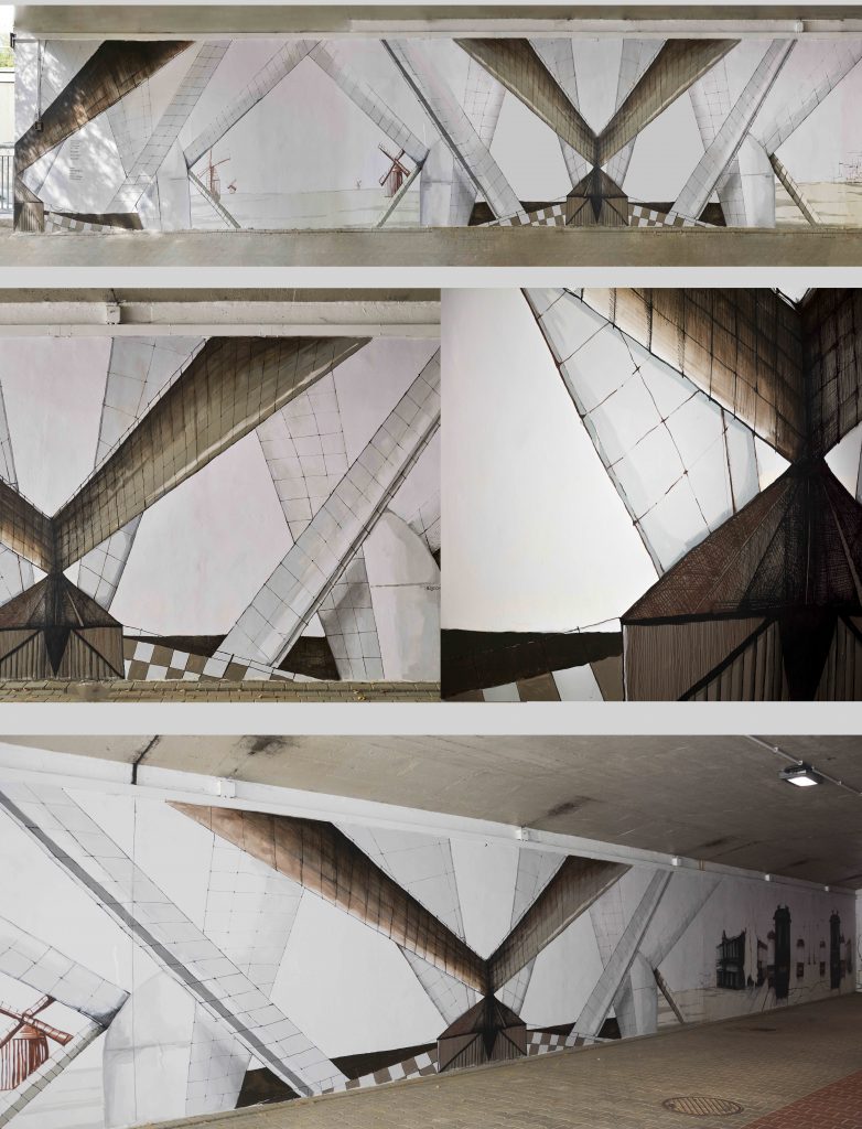 Prace nad malowidłem rozpoczęły się dzięki pomysłowi Lucyny Gawuć, która zgłosiła projekt w ramach budżetu partycypacyjnego na rok 2018. Ostateczny wygląd wartego 47 tysięcy złotych muralu wybrali w głosowaniu mieszkańcy. Ma on 200 metrów długości i opowiada o Woli i Ochocie jakie były, jakie są i jakimi się staną według wizji autorki Izabela Siemiątkowska, realizowanej przez graficiarzy. Są na nim m.in. stare młyny, od których nazwę wywodzi osiedle Młynów, pałacyk Michla, stara gazownia, a także wieżowiec Warsaw Spire i park wodny Moczydło.